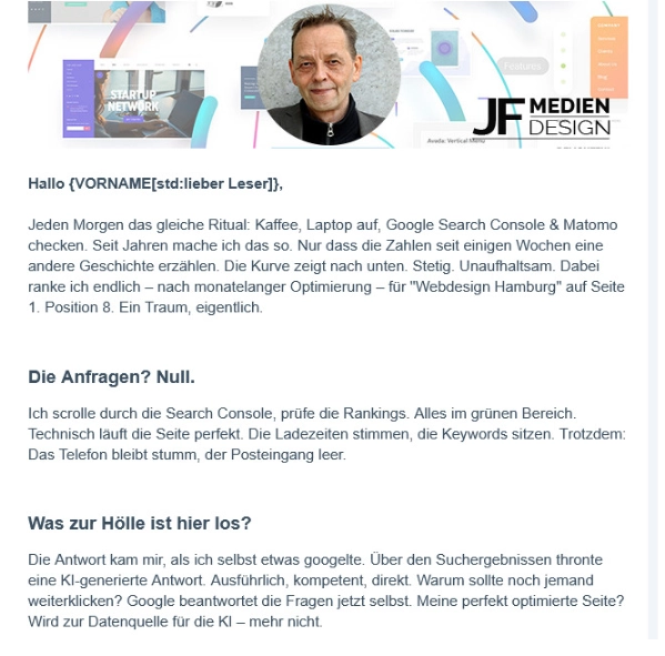 Ich helfe seit Jahren Unternehmen und Selbstständigen dabei, Websites zu gestalten, die wirklich funktionieren – nicht nur gut aussehen. Im Newsletter teile ich das Wissen, das in echten Projekten Ergebnisse liefert.